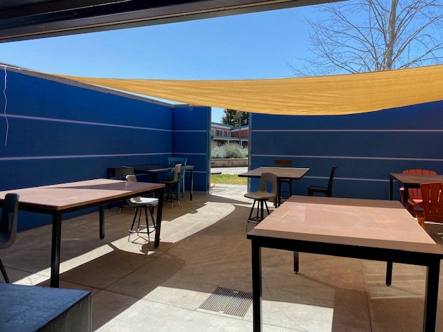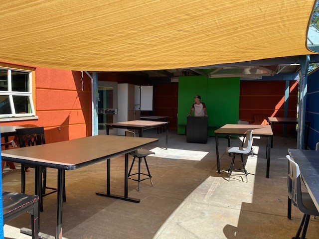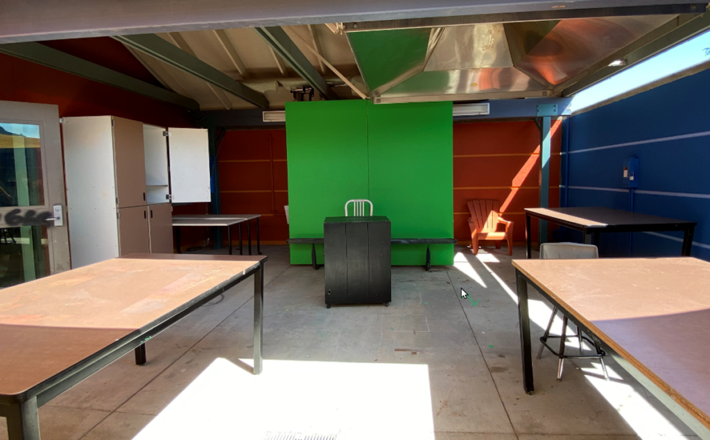 What was once a simple patio beside a south classroom has been transformed into a new learning/teaching/working space. Yes, that’s a green screen you see in that picture because this is a classroom that can handle virtual instruction. But it’s more – it’s a large, airy workspace. This area is completely enclosed and shaded; it even has a swing gate, making it easy to bring materials in and out – things that are big, things that are dirty, things that might not fit through a standard classroom door. This is a space where students can build all the wonderful things they can imagine!